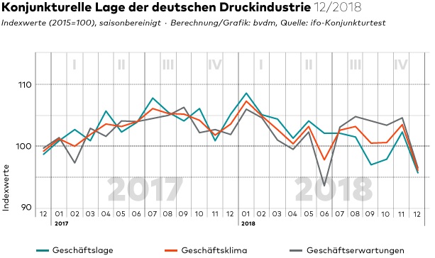 De Duitse branchevereniging Bundesverband Druck und Medien laat regelmatig de bedrijfseconomische sfeer bij hun leden meten door ifo Institut. De stemming is een mix van bezetting en verwachtingen. De meting van december 2018 toont een negatief beeld dat al in november ingezet is. Dat beeld is exact het tegenovergestelde van het jaar er voor. Misschien biedt dat troost, want na die piek die eindigde in januari 2018 toonde de koers in 2018 in grote lijnen een daling. Mogelijk komt na deze daling weer een stijging.