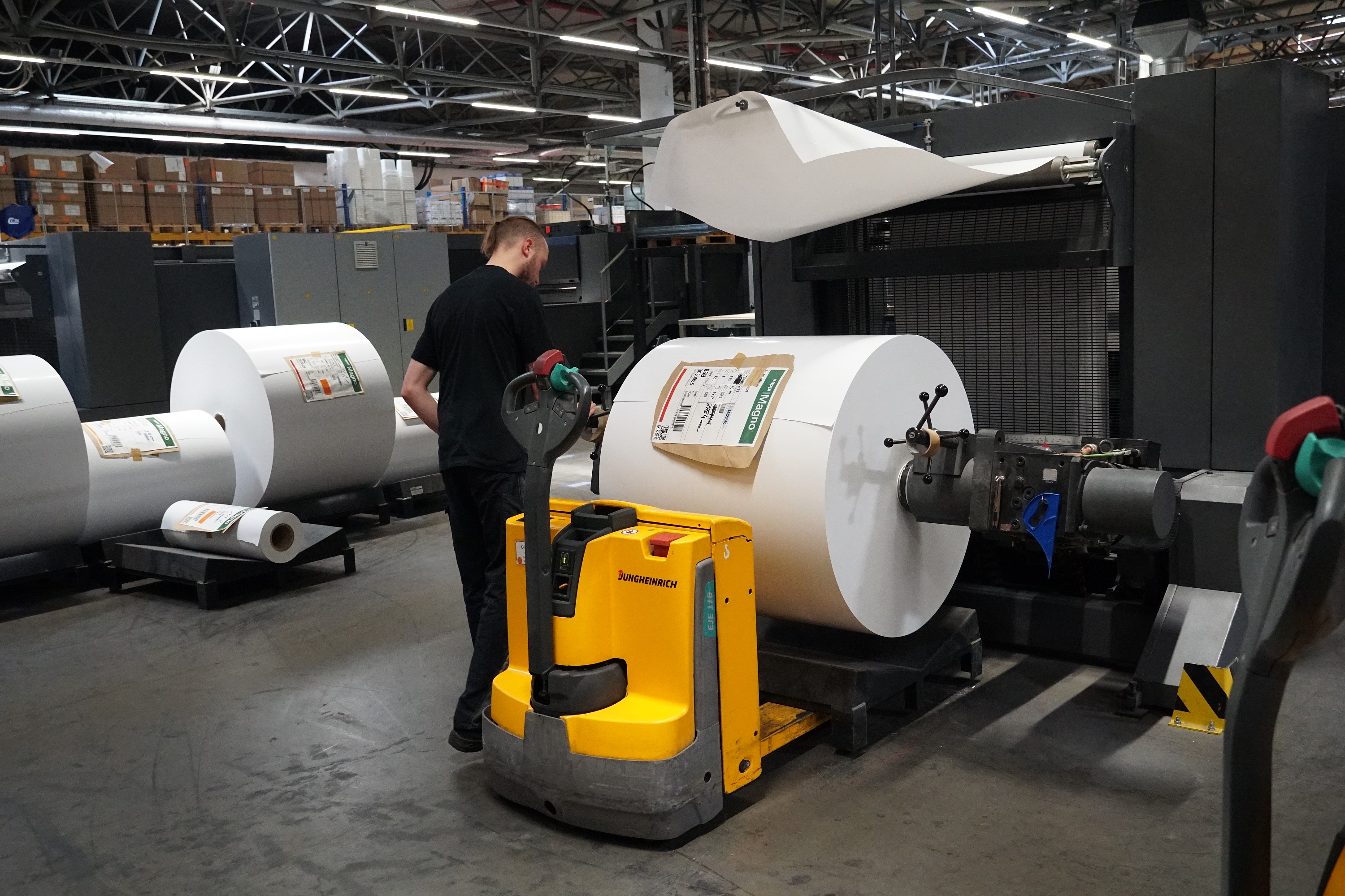 In de uitleg van de pers worden vellen met twee grijpers getransporteerd, waardoor ze exact op de aflegstapel worden gepositioneerd. Hierdoor hoeven vellen niet meer te worden afgeremd en zijn de hiervoor benodigde witranden niet meer nodig. De daardoor ontstane bedrukbare velgrootte van 160 cm betekent dat er meer opdrachten op een vel kunnen worden gedrukt. ‘We zijn er in geslaagd de tien procent prijsverhogingen van papier te compenseren door middel van innovatie en toegenomen efficiëntie’, aldus Sauer. ‘Dit is des te belangrijker omdat papier goed is voor dertig procent van onze kosten.’ Een extra voordeeltje is dat papier van de rol zo’n zes procent goedkoper is dan vellen. Niet onbelangrijk als je per jaar zo’n 25.000 ton papier verwerkt.