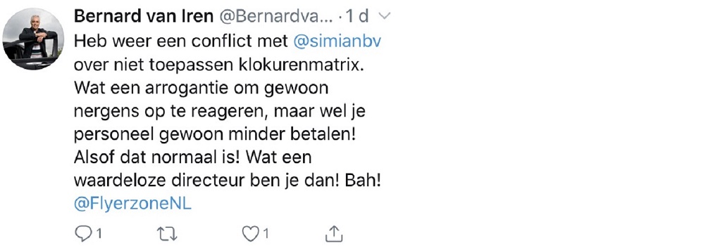 Een venijnige tweet plaatste FNV-grafimedia bestuurder Bernard van Iren richting directeur Wouter Haan van internetdrukker Simian. Die zou contactverzoeken negeren om tekst en uitleg te geven over het opschorten van de klokurenmatrix, de toeslag voor het buiten dagdienst werken. Wouter Haan reageert geprikkeld: ‘Bernard heeft gewoon mijn 06 en ik ben goed bereikbaar. Maar de FNV wil bij Simian leden winnen door altijd maar zuur over mij te doen.’